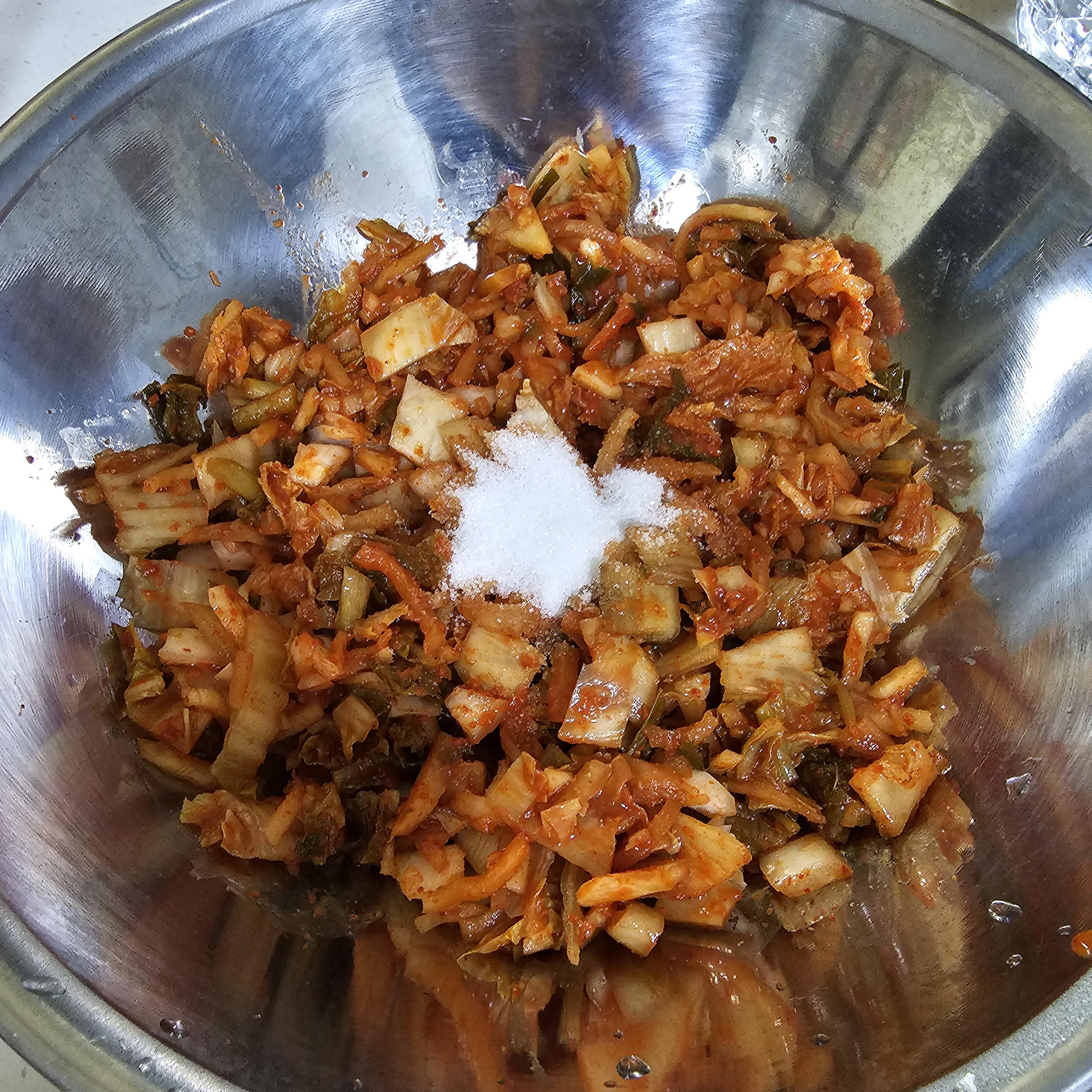 2. 김치가 담긴 볼에 설탕 2큰술을 넣어줍니다.